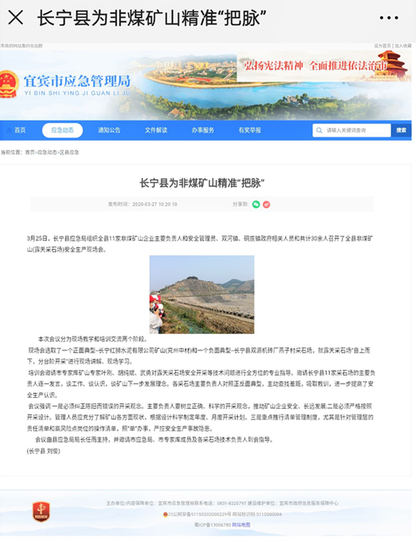3月25日,宜賓市長寧縣應急局組織全縣11家非煤礦山企業負責人和安全管理員、雙河鎮以及硐底鎮政府相關人員共計30余人召開了全縣非煤礦山(露天采石場)安全生產現場會。 長寧縣應急局邀請兗州中材長寧分公司作為全縣非煤礦山的正面典型為參會企業分享開采經驗。 上午9點參會人員到達長寧分公司―紅獅水泥礦山現場,分公司員工與業主接待了到場的市縣領導以及企業參會人員。同時嚴格按照防疫要求進行體溫測量,人員信息登記入場。   9:30分全部人員到齊,由長寧分公司職工帶領大家參觀礦山現場,為參觀人員介紹礦山整體情況,相關開采技術,并解答參觀人員提出的問題。    10:30參觀結束,參觀人員對于此行都感到滿意,我們的礦山工作也得到了大家的認可,相關同仁們都紛紛表達此行收獲甚多。 現場參觀學習結束后,當天下午召開了室內培訓會,培訓會邀請了市專家庫專家,同時長寧分公司職工葉剛同志很榮幸在受邀之列。 針對于非煤礦山安全開采等技術問題,兗州中材長寧分公司作為正面企業給參會企業分享了好的經驗,同時也從會議中汲取了其他好的經驗方法。 3月27日,宜賓市應急管理局報道了此次會議。此次會議中市縣領導高度評價了兗州中材長寧分公司的礦山開采工作,同時被市縣領導評為正面典型我司感到很榮幸。在此后的工作中我們要更努力,爭取更大的進步,樹立好我們的企業形象。 |