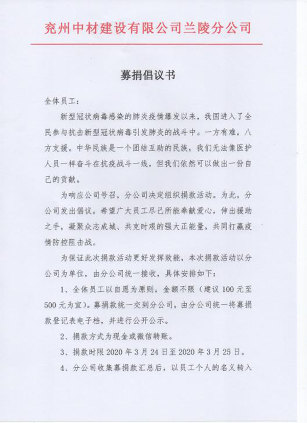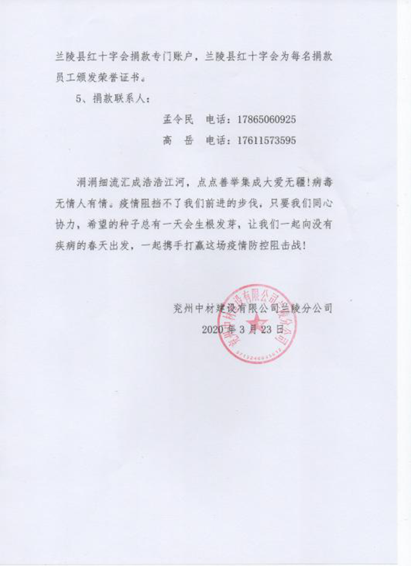 陽(yáng)春三月,乍暖還寒。全國(guó)疫情防控工作取得重大勝果接近尾聲之際,仍有很多人士奮斗在抗疫第一線。災(zāi)害無(wú)情,人間有愛(ài),近日來(lái),蘭陵分公司積極響應(yīng)公司號(hào)召,組織開(kāi)展為防控新冠肺炎疫情捐款活動(dòng),助力新冠肺炎疫情防控工作。   蘭陵分公司下發(fā)了《募捐倡議書(shū)》,堅(jiān)持自覺(jué)自愿與量力而行的原則,呼吁全體員工積極參與,奉獻(xiàn)愛(ài)心,捐款助力抗擊疫情。分公司經(jīng)理龔士朋同志帶頭捐款,以實(shí)際行動(dòng)做表率,起到很好的模范作用。在龔經(jīng)理的帶動(dòng)下,分公司全體員工積極響應(yīng),紛紛捐款,每一名員工都獻(xiàn)出一份愛(ài)心。  經(jīng)過(guò)幾日的募捐,蘭陵分公司共籌集善款8000余元。3月25日,分公司安環(huán)科長(zhǎng)孟令民同志,代表分公司將所籌善款轉(zhuǎn)交蘭陵縣紅十字會(huì)。紅十字會(huì)工作人員表示會(huì)將善款上交省紅十字會(huì),全部用于新冠病毒疫情防控工作。并對(duì)捐款表示十分感謝,對(duì)此崇高的人道主義精神和奉獻(xiàn)愛(ài)心的善舉,表示誠(chéng)摯的敬意。最后頒發(fā)給捐贈(zèng)者榮譽(yù)證書(shū)。 涓涓細(xì)流匯成浩浩江河,點(diǎn)點(diǎn)善舉集成大愛(ài)無(wú)疆!病毒無(wú)情人有情。疫情阻擋不了我們前進(jìn)的步伐,只要我們同心協(xié)力,希望的種子總有一天會(huì)生根發(fā)芽,讓我們一起向沒(méi)有疾病的春天出發(fā),一起攜手打贏這場(chǎng)疫情防控阻擊戰(zhàn)! |