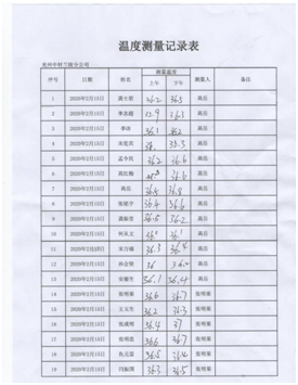 配合當(dāng)?shù)卣w溫監(jiān)測(cè) 落實(shí)措施,扎實(shí)開展防控工作。分公司設(shè)立疫情防控點(diǎn),配備防護(hù)口罩、手套、防護(hù)鏡、體溫計(jì)及測(cè)溫槍、酒精、84消毒液、噴霧器等防護(hù)物資。嚴(yán)格控制返程人員,對(duì)居住或經(jīng)過疫情防控重點(diǎn)區(qū)域人員,要求暫不返回項(xiàng)目部,居家隔離自我觀察;要求返回項(xiàng)目部人員,返程路上嚴(yán)格落實(shí)個(gè)人防控措施,制定記錄表,對(duì)返回人員嚴(yán)格檢查、登記;返回項(xiàng)目部后,在項(xiàng)目部?jī)?nèi)自行隔離14天,每天早晚測(cè)量體溫并做好記錄。    返程人員登記 每日體溫監(jiān)測(cè) 集中開展項(xiàng)目部衛(wèi)生消毒工作。分公司通過多種渠道,購(gòu)進(jìn)酒精、84消毒液等藥品,每天上午下午各進(jìn)行一次集中消毒工作,辦公室、會(huì)議室、廚房、餐廳、宿舍、衛(wèi)生間、走廊、院內(nèi)邊邊角角,全面消殺。  項(xiàng)目部消毒 消毒記錄