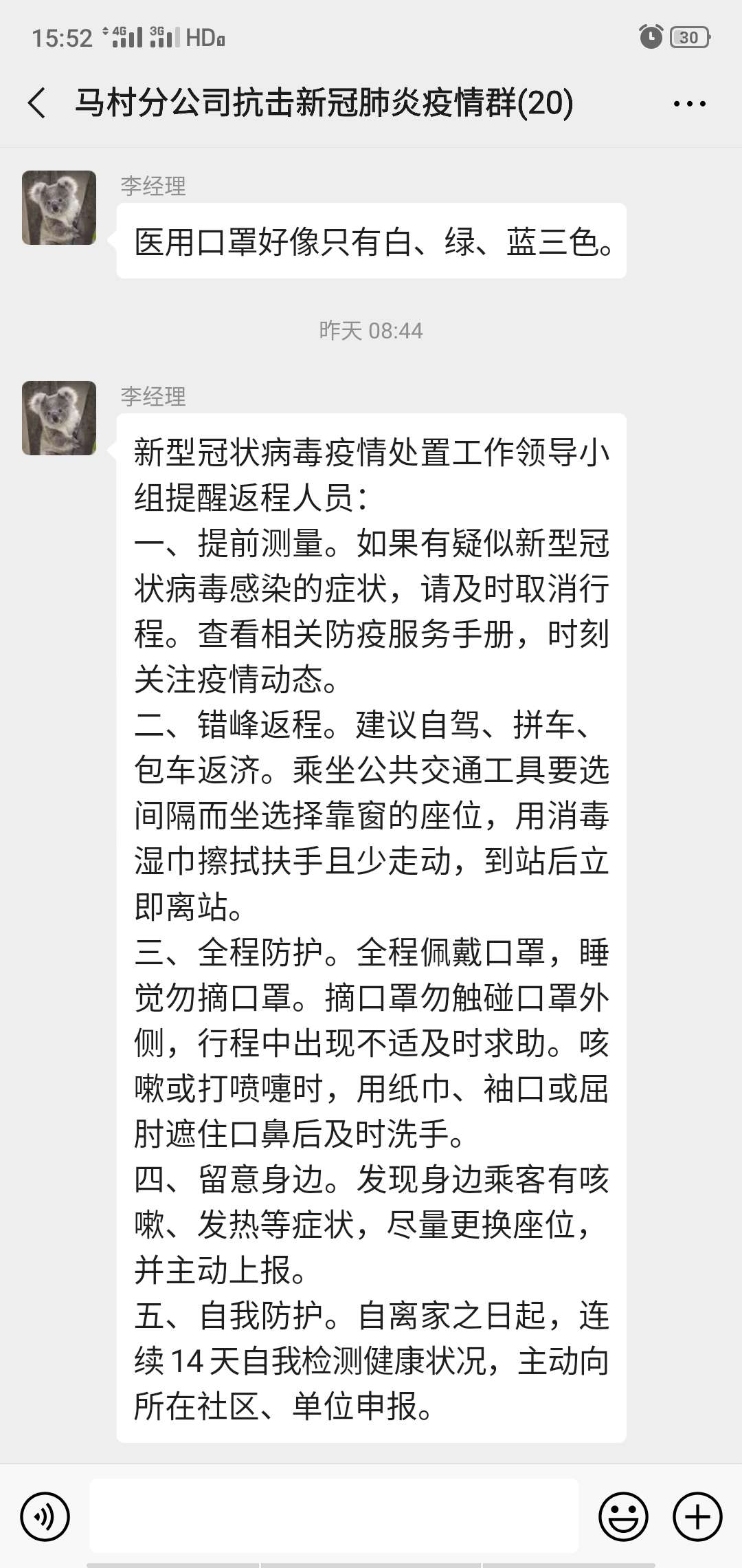突如其來的災(zāi)難讓本該舉國同慶的春節(jié)變的人心惶惶。為打好這場保衛(wèi)全國人民的硬仗,2020年1月25日前后,全國30多個省啟動重大突發(fā)公共衛(wèi)生事件一級響應(yīng),實(shí)行最嚴(yán)格的科學(xué)防控措施。同時各地方政府也出臺相應(yīng)的防控的舉措。 為有效控制疫情的傳播,針對疫情期間的各項工作安排,兗州中材馬村分公司于2020年1月29日成立應(yīng)對疫情工作領(lǐng)導(dǎo)小組。根據(jù)省委、省政府及公司關(guān)于做好疫情防控的重大決策部署,全面落實(shí)分公司的相關(guān)工作要求,負(fù)責(zé)與分公司上級及地方、千業(yè)水泥疫情工作的聯(lián)系,協(xié)調(diào)好疫情期間的人員以及各項工作安排。 假期期間,通過網(wǎng)絡(luò)通訊設(shè)備進(jìn)行安全防疫宣傳教育。  通過宣傳欄、條幅等向員工傳達(dá)疫情防控知識,提高疫情防控意識。   通過有效途徑采集各類防疫物資,主要包括醫(yī)用酒精、84消毒液、一次性口罩、便攜式噴霧瓶以及測溫儀等。    通過對辦公室、走廊、宿舍以及衛(wèi)生間等公共場所以及公共設(shè)備設(shè)施進(jìn)行消毒,早晚各一次。  分公司門口設(shè)置崗哨,無關(guān)人員禁止出入;對相關(guān)人員進(jìn)行信息登記,對進(jìn)出人員進(jìn)行測體溫并登記,無異常才允許進(jìn)入,如發(fā)現(xiàn)異常及時上報處理。  公司員工每天測量體溫,匯報身體狀況;對于外地返崗人員,按照相關(guān)規(guī)定進(jìn)行相應(yīng)的隔離,隔離期間每天3次匯報體溫,并接受地方政府及先關(guān)人員的監(jiān)督,確保萬無一失。