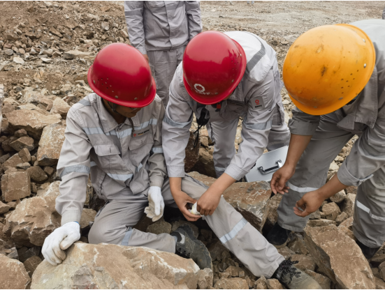 上午10時整,演練正式拉開序幕。假設情況是該露天礦山某區域發生了邊坡坍塌,造成一名作業人員腿部受傷被困。接到報告后,項目副經理楊宇立即啟動應急預案,迅速組織了由醫療救護組、應急搶險組、警戒保衛組、物資保障組等部門人員組成的應急救援隊伍,攜帶救援裝備,迅速趕赴事故現場。同時,通訊保障組也迅速建立起臨時通訊網絡,確保現場信息暢通無阻。