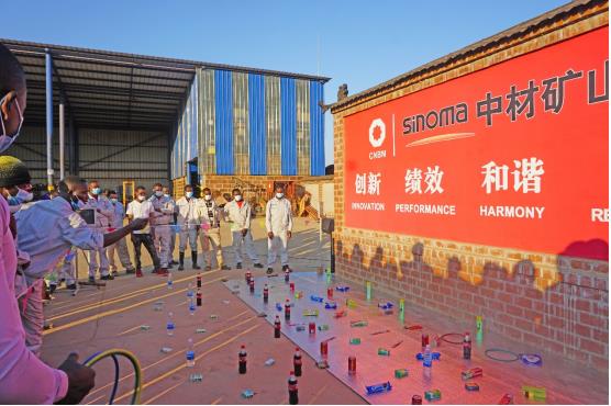 舉行以各生產(chǎn)部門為團(tuán)隊(duì)的拔河比賽,圖片為中方員工組成團(tuán)隊(duì)與贊方員工比賽圖。